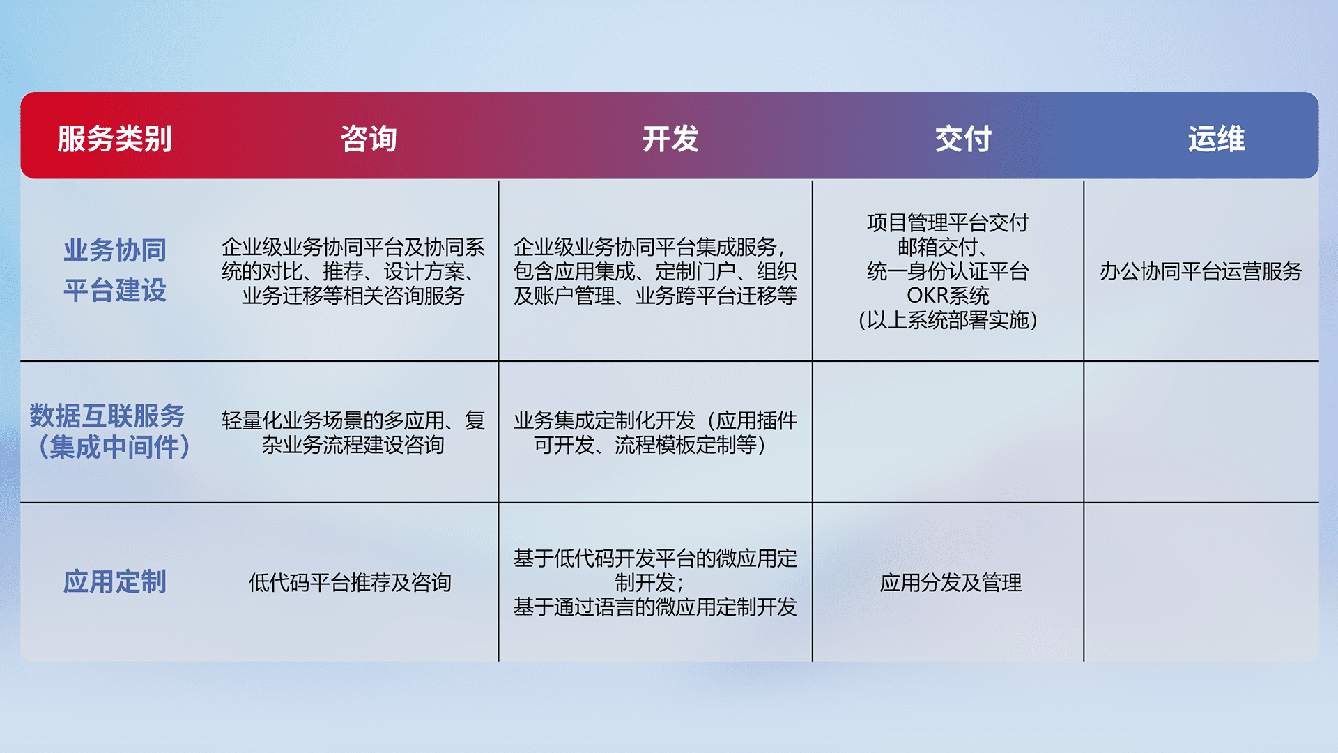 针对钉钉、、企微、、、IDaas等平台级产品提供产品的规划、、方案、、交付、、、定制化开发等服务,,,,实现如统一协同办公、、、智能客户服务、、、、混合会议管理、、、智能数据查询、、、等业务场景,,,,实现数字化转型。。