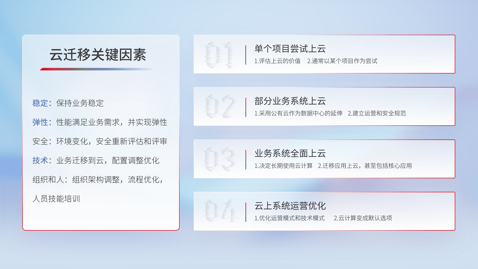 结合实际业务,,从规划设计、、、、云平台选型、、、、云原生改造、、数据迁移、、集成交付,,迁移全过程为客户识别最佳上云路径,,,,做好风险识别管理,,,设计网络架构、、、、身份权限、、安全审计合规、、操作审计、、、、日志审计、、监控告警策略、、、、多站点容灾设计等,,,,对云上基础设施进行整体规划,,提升IT治理水平,,以满足弹性、、、、高可用、、高性能的需求。。。
