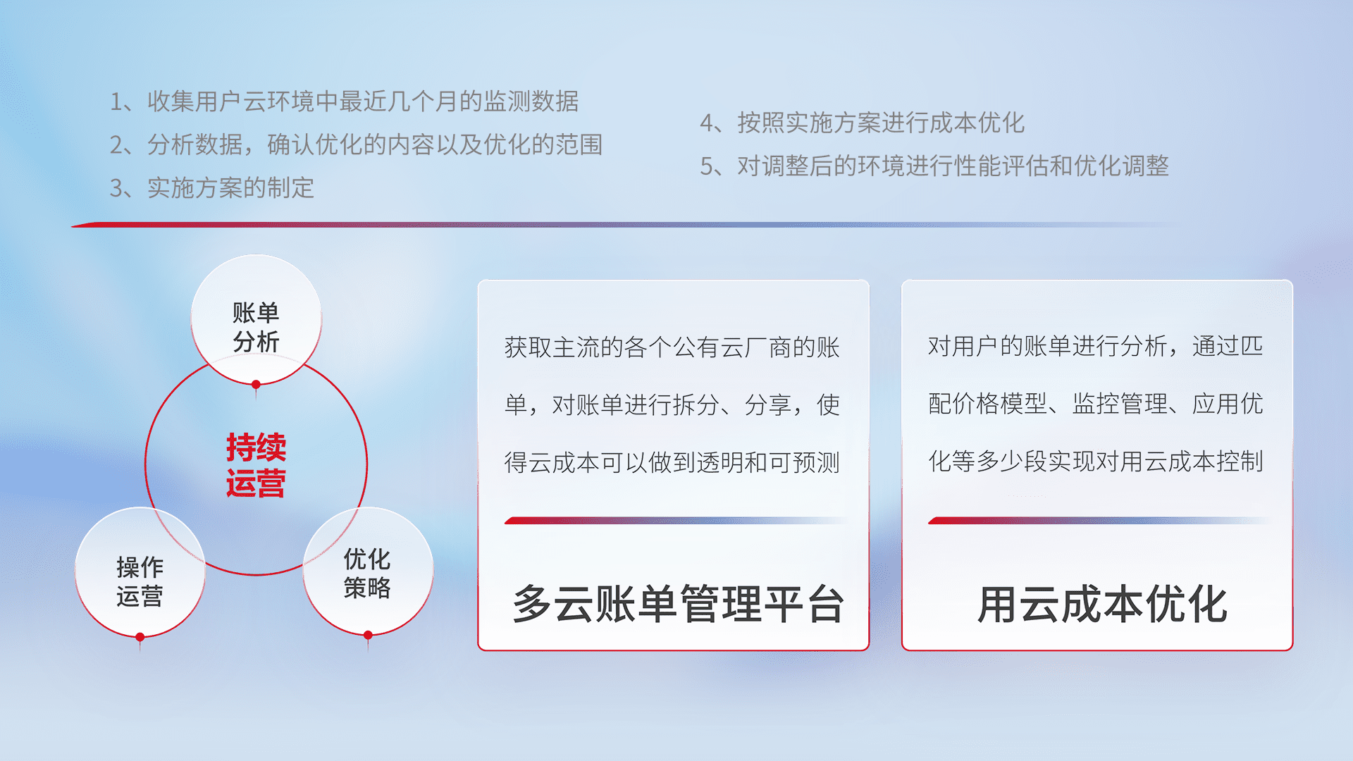 通过多云纳管,,,,以统一的资源数据模型把客户的云资源进行抽象和封装,,,进而实现对多云资源的统一操作,,保障云资源管理的可靠性、、、稳定性与可用性。。量身定制化运维内容,,,,配置、、、、开发运维、、补丁管理、、备份、、、监控、、认证和访问管理、、、审计和日常巡检等,,,,保障在用云过程中的可靠度,,,,稳定度以及高可用率。。